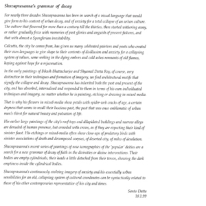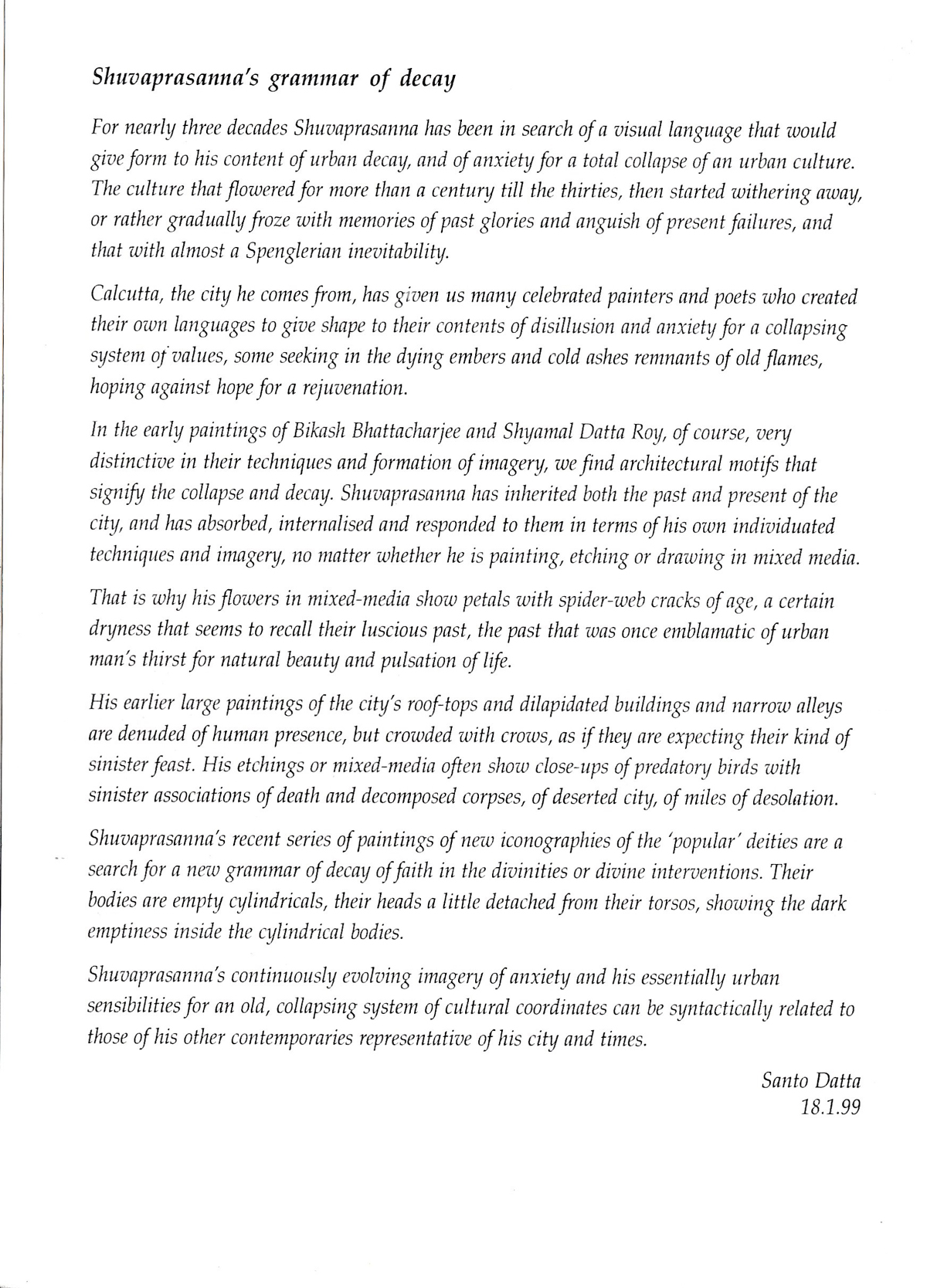 His themes come from his personal interactions with its urban milieu - its sickness and sordidness, its violence and vulnerability and all that compounds its existential agony. In the 1960s and 1971s, his work was influenced by the turbulence and political violence of Kolkata.