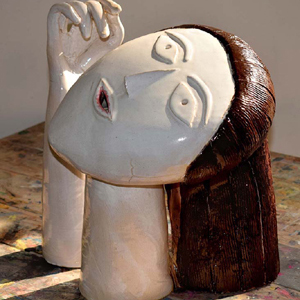 The eyes are large, whispering into the ears as the poet says, but contain only a hint of a pupil, reminiscent of those silver or ceramic eyes that are added on to the faces of idols in worship.Ceramic art is art made from ceramic materials, including clay. It may take forms including artistic pottery, including tableware, tiles, figurines and other sculpture. Ceramic art is one of the arts, particularly the visual arts. Of these, it is one of the plastic arts. While some ceramics are considered fine art, as pottery or sculpture, some are considered to be decorative, industrial or applied art objects. Ceramics may also be considered artefacts in archaeology. Ceramic art can be made by one person or by a group of people. In a pottery or ceramic factory, a group of people design, manufacture and decorate the art ware. Products from a pottery are sometimes referred to as art pottery.