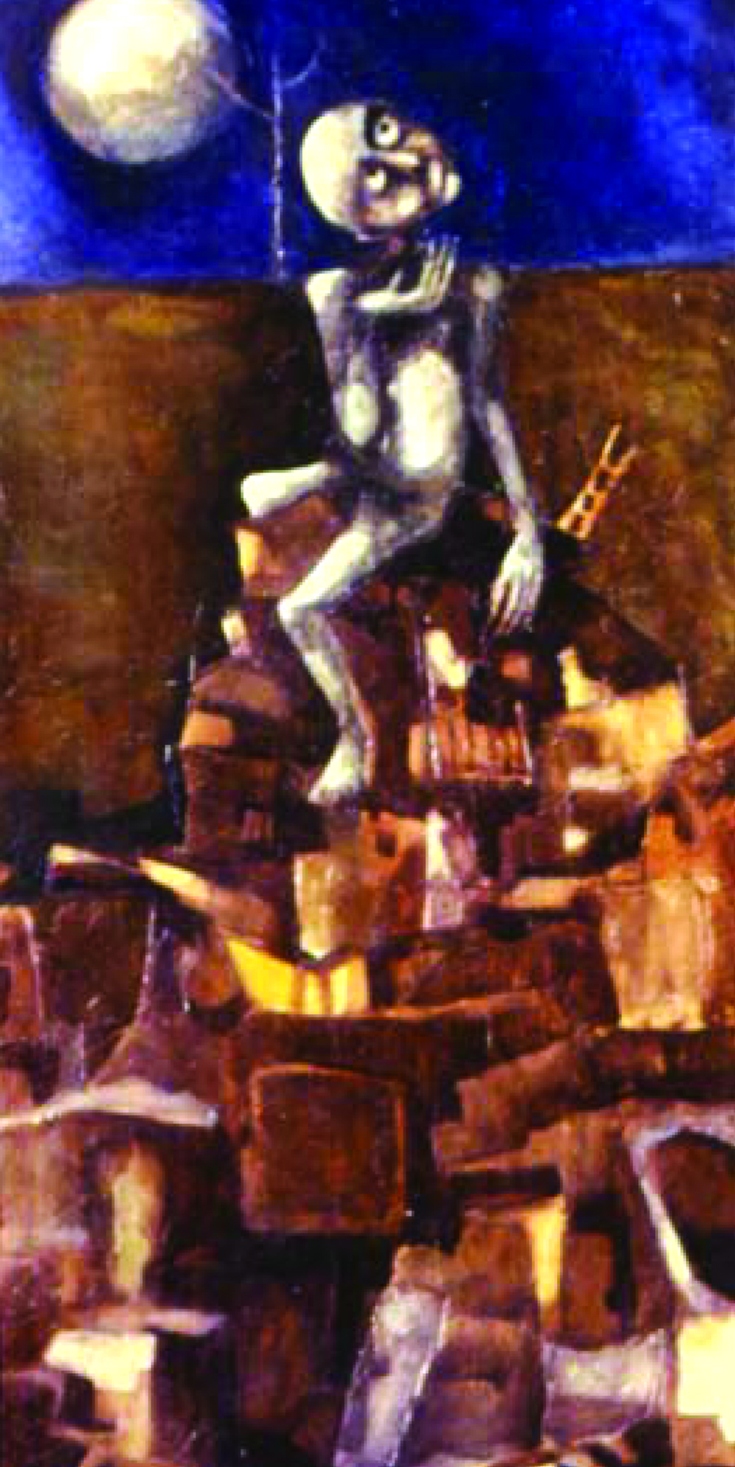 Man & Space are the other series that make recurring appearance as sketches, drawings, paintings and prints. While the latter featured nightmares of people suffering from drought and famine, the former made a reference to time in its multiple interpretations, ranging from cosmic continuity to its temporal nature, triggered by the German obsession with punctuality that Shuva encountered in that country.