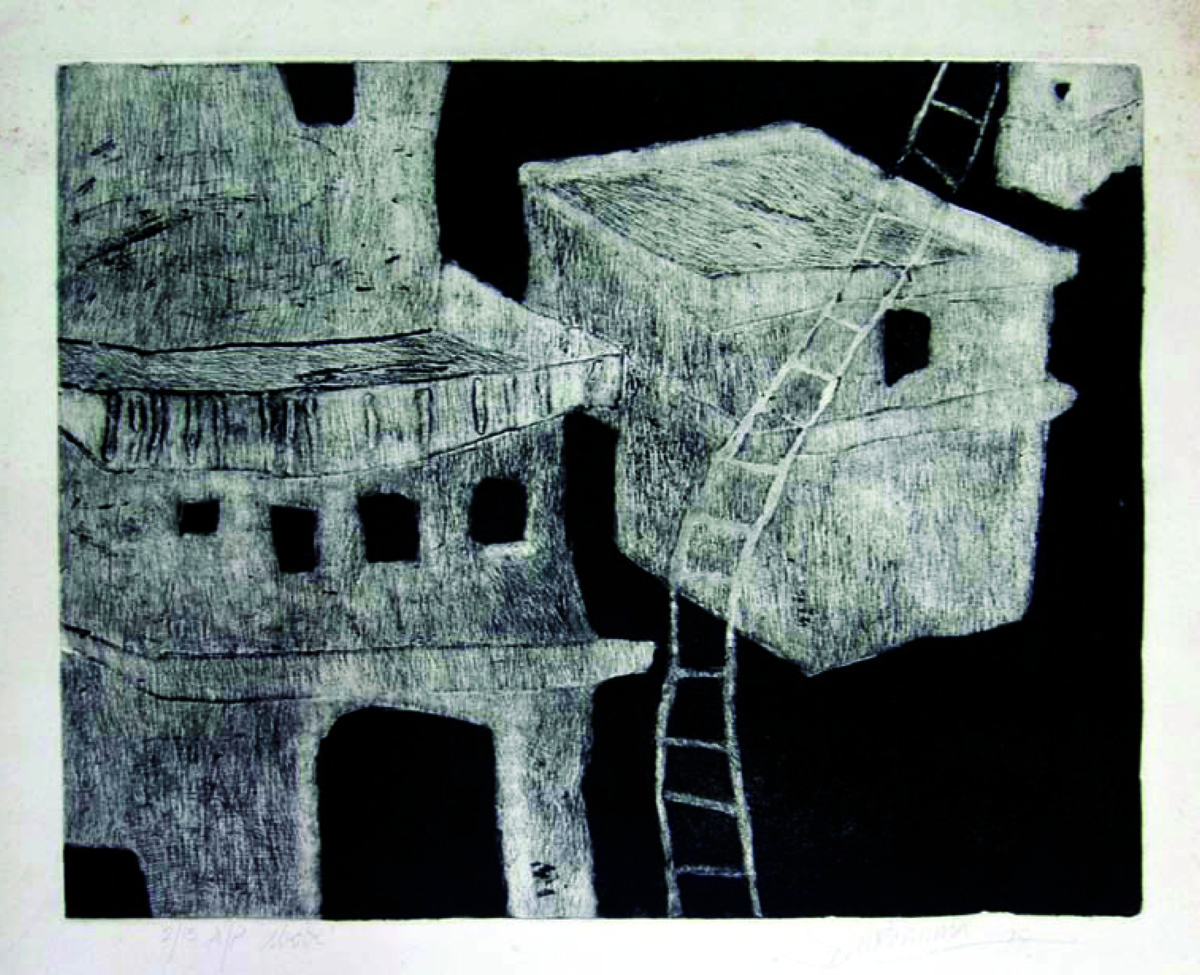 A predominance of black and white and sepia or burnt amber in his incredible series of paintings in charcoal and acrylic, that marked the Calcutta Tercentenary year, is described by the artist as my journalistic view of the city of my birth and life The city urban milieu, its gloom, daily struggles and cultural ethos continued to be depicted evocatively in graphic prints and other work of the 1970s and 1980s that includes Illusion, Abode and Lament. Expressions of dismay overlaid with a touch of hope in the culture and squalour of Calcutta, the city survival instinct despite its decay, is featured through a fusion of symbols and images. likes to work in series. Working in series allows me to reflect over a passage of time and develop an idea.